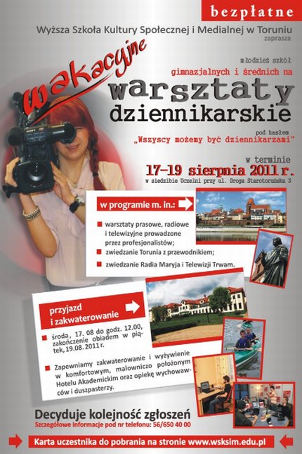 Wyższa Szkoła Kultury Społecznej i Medialnej w Toruniu zaprasza młodzież szkół gimnazjalnych i średnich na bezpłatne warsztaty dziennikarskie pod hasłem "Wszyscy możemy zostać dziennikarzami".