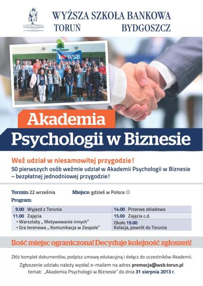 promocja@wsb.torun.pl, temat: "Akademia Psychologii w Biznesie".