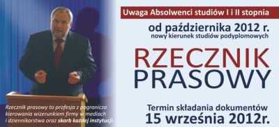 Rzecznik prasowy - to nowy kierunek studiów podyplomowych w Wyższej Szkole Kultury Społecznej i Medialnej w Toruniu. Początek zajęć planowany jest na październik 2012r.