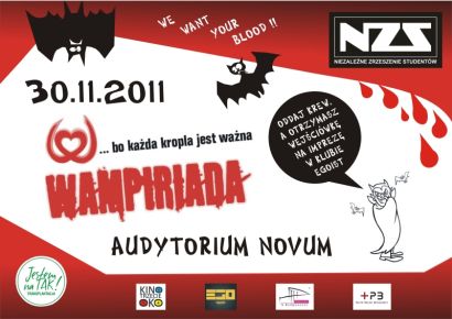 Już jutro, 30 listopada br. w w Auditorium Novum odbędzie się kolejna edycja Wampiriady. Patronat honorowy nad wydarzeniem objął JM Rektor dr hab. Inż. Antoni Bukaluki, prof. nadzw. Uniwersytetu Technologiczno-Przyrodniego w Bydgoszczy.